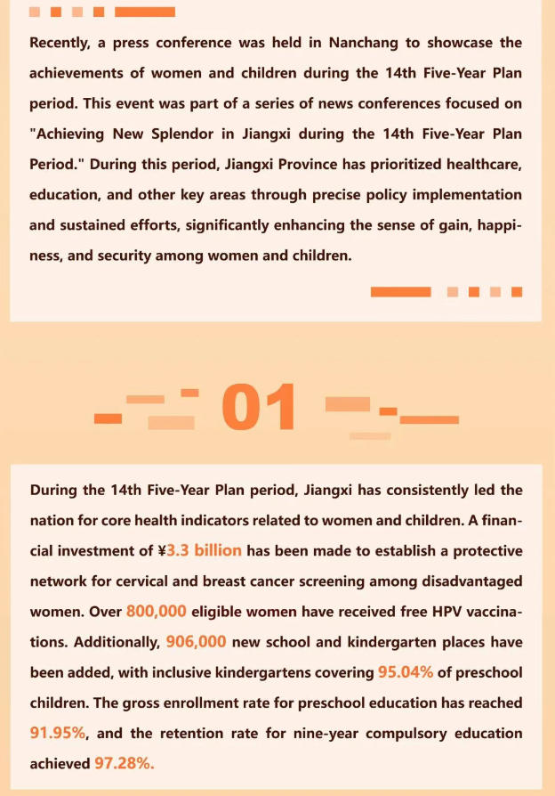Recently, a press conference was held in Nanchang to showcase the achievements of women and children during the 14th Five-Year Plan period. This event was part of a series of news conferences focused on "Achieving New Splendor in Jiangxi during the 14th Five-Year Plan Period." Throughout this period, Jiangxi Province has made continuous efforts across various fields, including health, education, social security, and overall development, significantly enhancing the well-being of women and children.