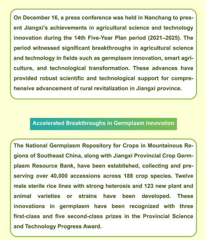 On December 16, a press conference was held in Nanchang to present Jiangxi’s achievements in agricultural science and technology innovation during the 14th Five-Year Plan period (2021–2025). The period witnessed significant breakthroughs in agricultural science and technology in fields such as germplasm innovation, smart agriculture, and technological transformation. These advances have provided robust scientific and technological support for comprehensive advancement of rural revitalization in Jiangxi province.